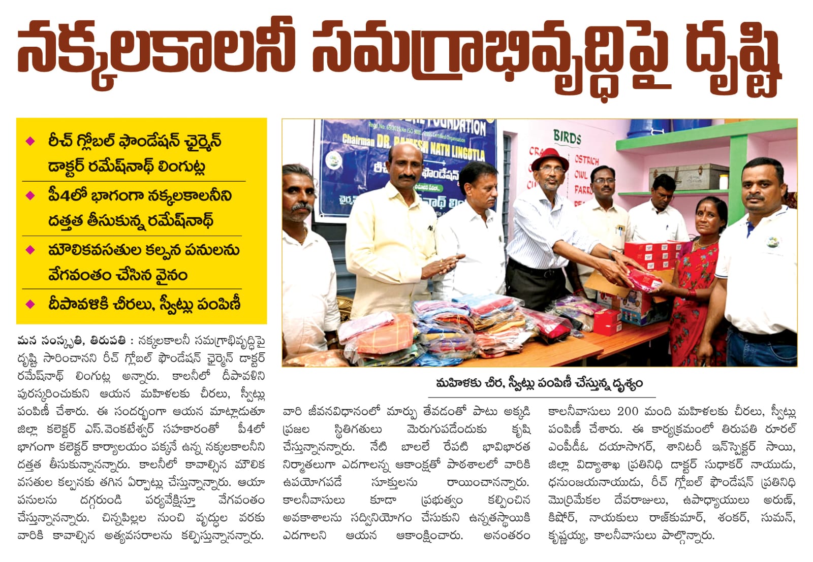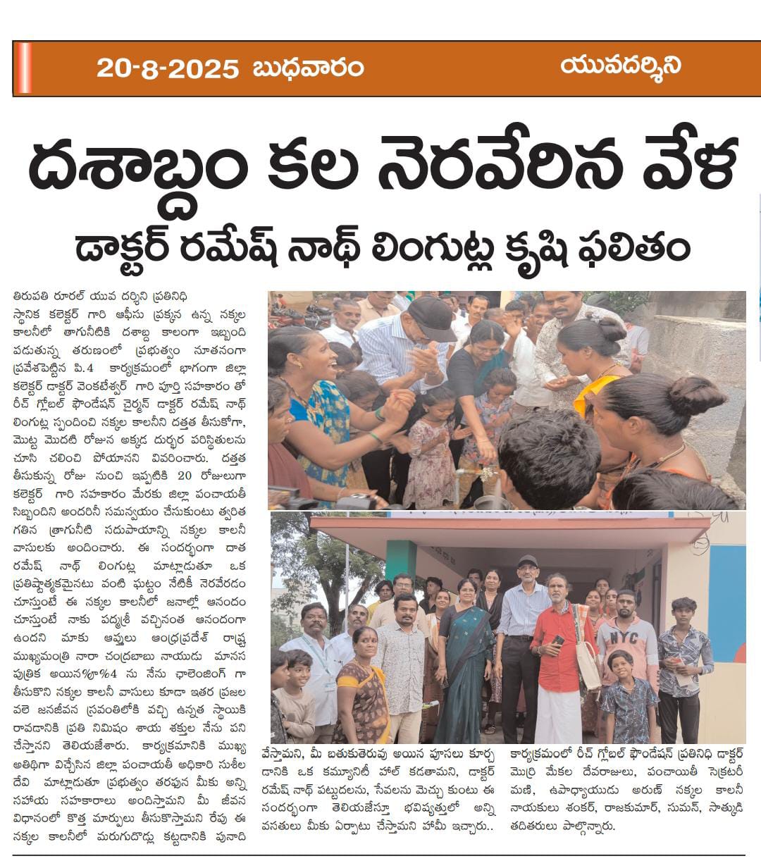 At a time when drinking water has been a problem in Nakkala Colony, located next to the local collector’s office, for the past decade, as part of the government’s newly introduced P4 program, Reach Global Foundation Chairman Ramesh Lingotla, with the full support of District Collector Venkateswar, responded and explained that he was shocked to see the miserable conditions there on the first day he adopted Nakkala Colony. Since the day of adoption, it has been 20 days since the District Collector, with the cooperation of the District Panchayat staff, coordinated with everyone and quickly provided drinking water facilities to Nakkala.