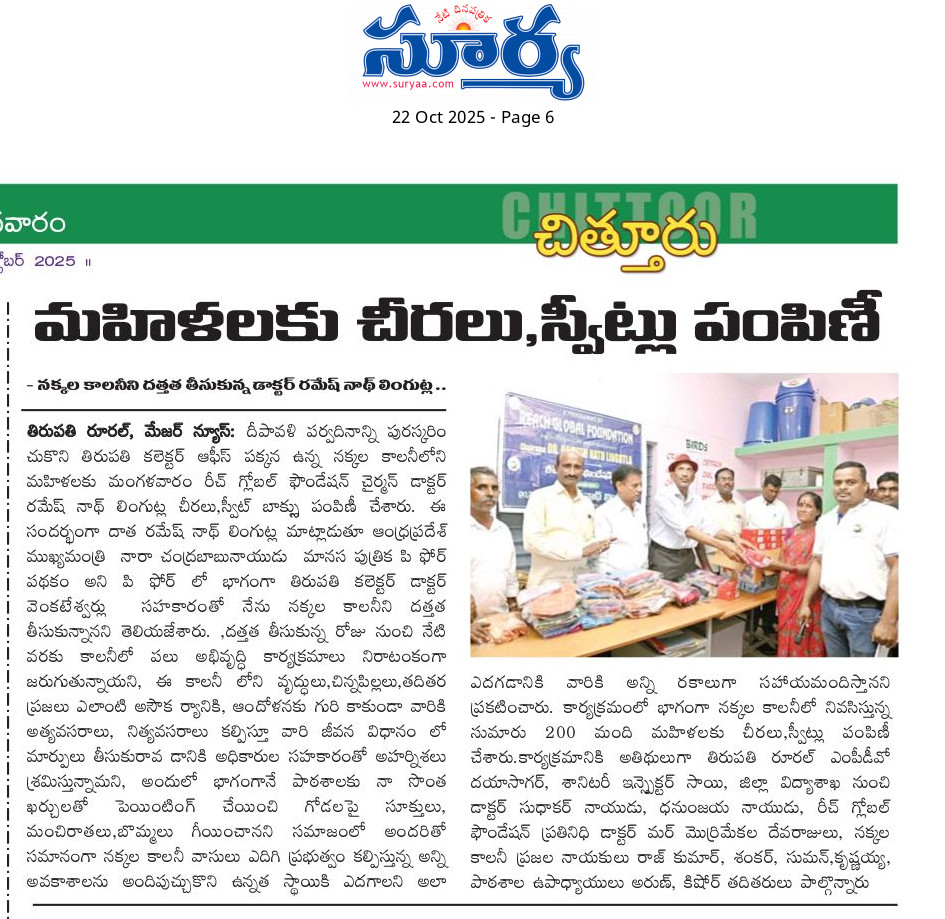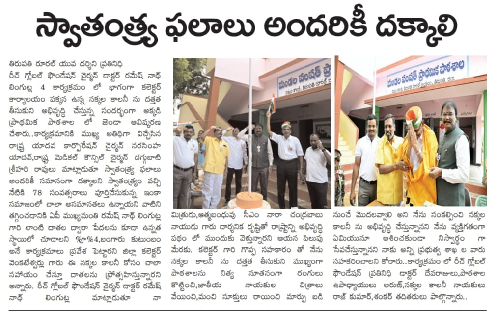 Tirupati District Reach Global Foundation Chairman Dr. Rameshnath Lingutla, as part of the P4 program, unfurled the flag at the primary school there on the occasion of adopting and developing the Nakkala colony next to the Collector’s office. The chief guests of the program were State Yadav Corporation Chairman Narasimha Yadav and State Medical Council Chairman Daggubati Srihari Rao. Speaking on the occasion, they said that the fruits of independence should be equally available to everyone.