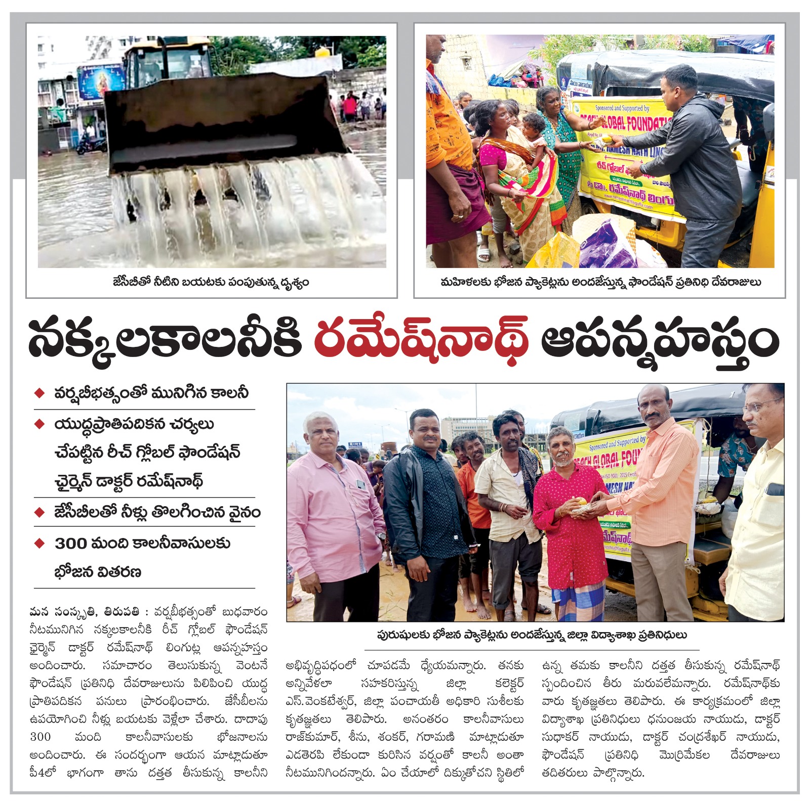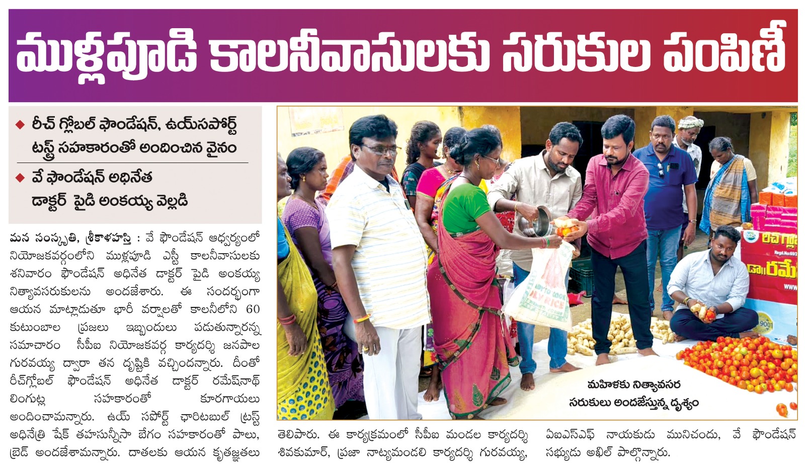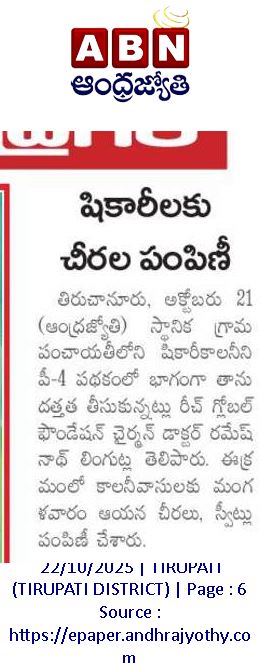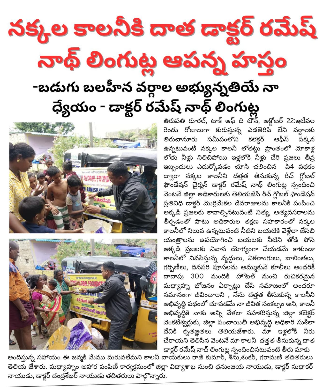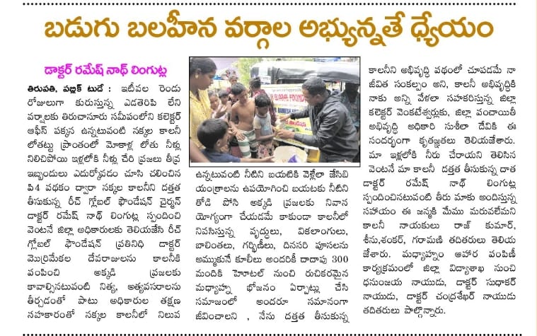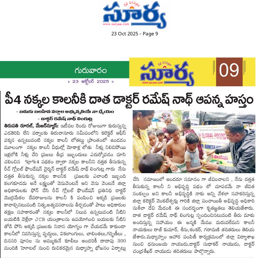రీచ్ గ్లోబల్ ఫౌండేషన్ చైర్మన్ డాక్టర్ రమేష్ నాథ్ లింగుట్ల గారు దత్తత తీసుకున్న నక్కల కాలనీ (కలెక్టర్ ఆఫీస్ పక్కన) వాసుల నివాస ప్రాంతం నిన్నటి రోజున కురిసిన భారీ వర్షానికి ఇళ్ళచుట్టూ నీరు చేరడం,అక్కడ నివసిస్తున్న వారు దినసరి కూలీలుగా పూసలు అమ్ముకోవడానికి వెళ్ళలేక పోవడం మూలంగా దాదాపు 110 కుటుంబాలకు(వృద్ధులు,వికలాంగులు,చిన్న పిల్లలు),మరియు ఓటేరు నక్కల కాలనీ వాసులు పడుతున్న ఇబ్బందుల దృష్ట్యా ఓటేరు నక్కల కాలనీ వాసులకు రెండు కాలనీలకు ఆహార సదుపాయం,తాగునీటి సదుపాయం ఇంటింటికీ అందించారు..